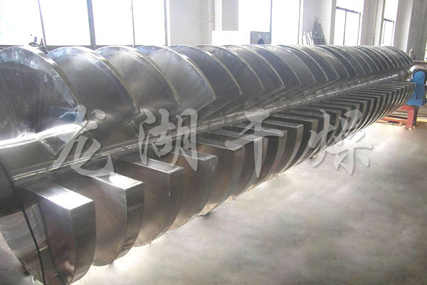 空心軸上密集排列著楔型中空漿葉,熱介質(zhì)經(jīng)空心軸流經(jīng)漿葉。單位有效容積內(nèi)傳熱面積很大,熱介質(zhì)溫度從-40℃到320℃,可以是水蒸汽,也可以是液體型:如熱水、導熱油等。間接傳導加熱,沒有攜帶空氣帶走熱量,熱量均用來加熱物料。熱量損失僅為通過器體保溫層向環(huán)境的散熱。楔型漿葉傳熱面具有自清潔功能。物料顆粒與楔型面的相對運動產(chǎn)生洗刷作用,能夠洗刷掉楔型面上附著物料,使運轉中一直保持著清潔的傳熱面。漿葉干燥機的殼體為Ω型,殼體內(nèi)一般安排二到四根空心攪拌軸。殼體有密封端蓋與上蓋,防止物料粉塵外泄而充分發(fā)揮作用。