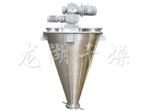 DSH系列的雙螺旋錐形混合機筒內兩只非對稱螺旋自轉將物料向上提升,轉臂慢速公轉運動;使螺旋外的物料,不同程度進入螺柱,從而達到全圓周方位物料的不斷更新擴散,被提到上部的兩股物料再向中心凹穴匯合,形成一股向下的物料流。