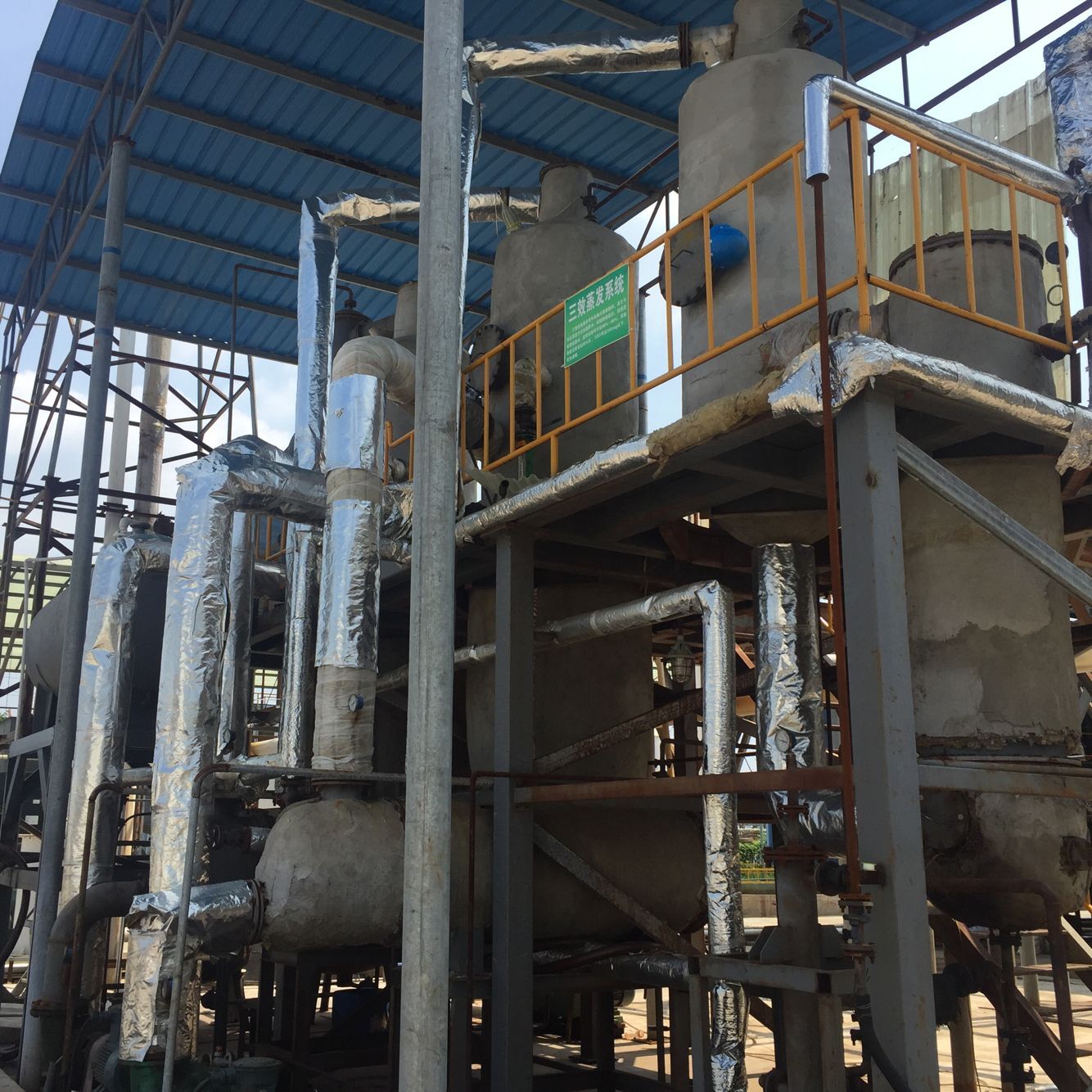 雙效蒸發器簡單的說就是兩個單效蒸發器串聯在一起,串聯的方式又分為并流、逆流、平流三種形式。加熱蒸發器、分離器、冷凝器、熱壓泵、保溫管、真空系統、料液輸送泵、冷凝排水泵、操作平臺、電器儀表控制柜及閥門、管路等系統組成。