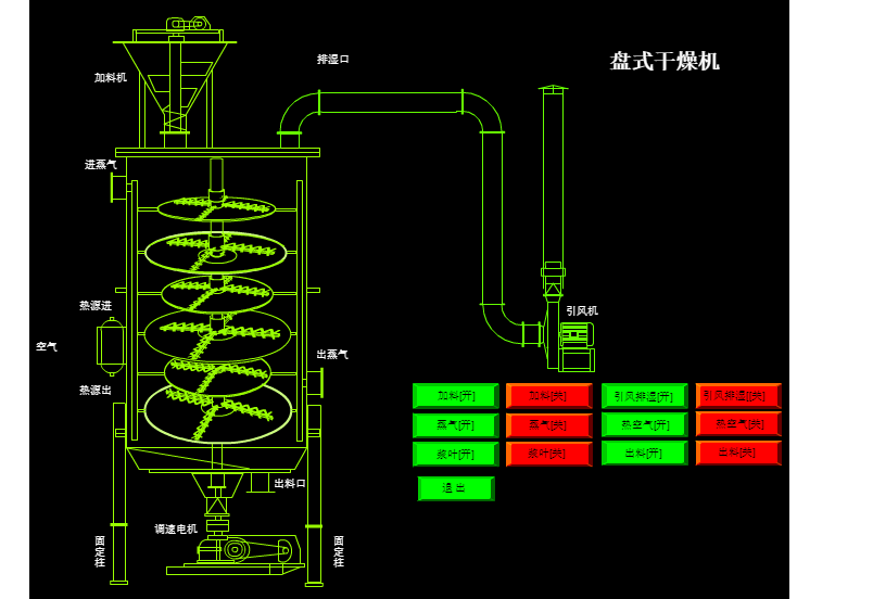 濕物料自加料器連續(xù)地加到干燥器上部干燥盤上,帶有耙葉的耙臂作回轉(zhuǎn)運動使耙臂作回轉(zhuǎn)運動使耙葉連續(xù)地翻抄物料。物料沿指數(shù)螺旋線流過干燥盤表面,在小干燥盤上的物料被移送到外緣,并在外緣落到下方的大干燥盤外緣,在大干盤上物料向里移動并從中間落料口落如下一層小干燥盤中。大小干燥盤上下交替排列,物料得以連續(xù)地流過整個干燥器。中空的干燥盤內(nèi)通入加熱介質(zhì),加熱介質(zhì)形式有飽和蒸汽、熱水和導(dǎo)熱油,加熱介質(zhì)由干燥盤的一端進入,從另一端導(dǎo)出。已干物料從后一層干燥盤落到殼體的底層,后被耙葉移送到出料口排出。濕份從物料中逸出,由設(shè)在頂蓋上的排濕口排出,真空型盤式干燥器的濕氣由設(shè)在頂蓋上的真空泵口排出。從底層排出的干物料可直接包裝。通過配加翅片加熱器、溶劑回收冷凝器、袋式除塵器、干料返混機構(gòu)、引風(fēng)機等輔機,可提高其干燥的生產(chǎn)能力,干燥膏糊狀和熱敏性物 料,可方便地回收溶劑,并能進行熱解和反應(yīng)操作。