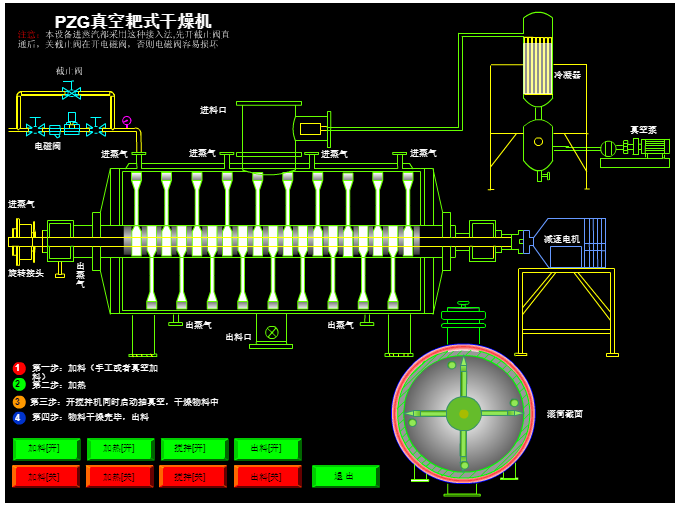 真空耙式干燥機(jī)操作簡單,進(jìn)出物料方便,大幅度減輕了工人勞動(dòng)強(qiáng)度,同時(shí)也減少了物料在干燥過程中受到的環(huán)境污染,提高了產(chǎn)品質(zhì)量,符合藥品管理規(guī)范“GMP”的要求。